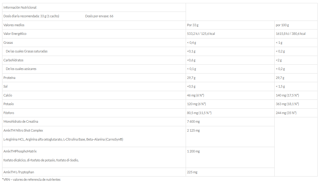 Amix® Monster Beef Protein está compuesto en un 90% por aislado hidrolizado enzimático de carne de vacuno. Amix® Monster Beef Protein está enriquecido con Monohidrato de creatina. Además contiene el complejo Nitro Shot (citrulina malato, Beta-Alalina y Phosphomatrix). Perfectamente soluble, bajo contenido de grasa y sin azúcares.
