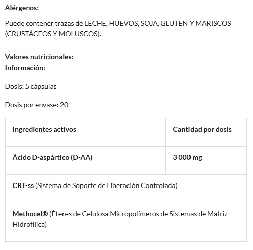 - Tecnología de liberación controlada (CRT-SS): Utiliza el sistema Methocel® para una liberación gradual, optimizando la absorción del ácido D-aspártico.
