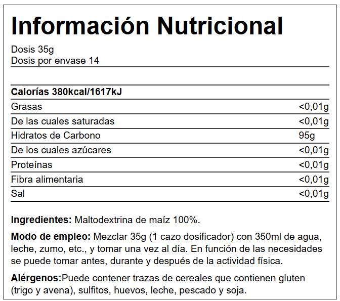 Maltodextrin es un suplemento alimenticio en polvo obtenido a partir del almidón de maíz, ideal para aquellos que buscan una fuente rápida y eficiente de carbohidratos. Esta fórmula de carbohidratos de liberación rápida es perfecta tanto para antes como después de entrenar: antes, para potenciar tus entrenamientos con energía extra, y después, para recargar tus reservas de energía de manera eficiente. Ideal para quienes desean ganar peso o incrementar su rendimiento deportivo.